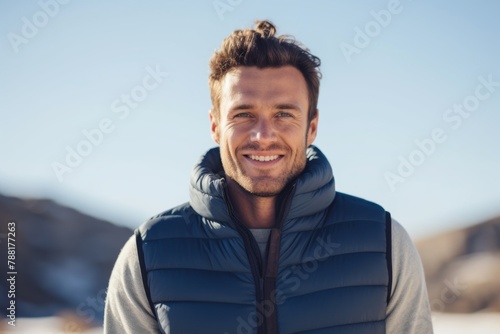Portrait of a smiling man in his 30s dressed in a thermal insulation vest isolated on minimalist or empty room background