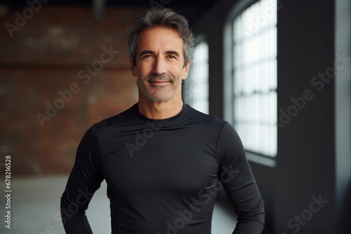Portrait of a smiling man in his 50s showing off a lightweight base layer against a empty modern loft background. AI Generation