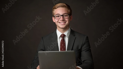 businessman, portrait, laptop, computer, technology, young, smiling, happy, success, professional, corporate, office, career, ambition, future, confident, determined, motivated, driven, achievement, goal, work, job, student, teenage, adult, male, model, attire, suit, attaching, goggles, formal, background, dark, grey, studio, photo