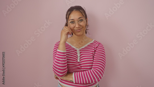 Portrait of a smiling, young hispanic woman in a pink striped top against a pink background, exuding confidence and style.