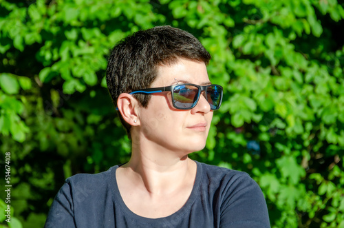 portrait, woman, brunette, natural, background, sunglasses, summer, day, foliage, short, hair, text, space, closeup, profile, look, strong, strict, serious, 40s, 30s, head shot, lesbian, beautiful, pretty, confident, forest, tree, blurry, pierced, green, attractive, adult, female, stylish, lady, model, fashion, person, style, closeup, park, cosmetic, no, colours, trendy