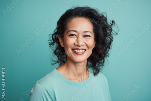 Portrait of a tender asian woman in her 50s smiling at the camera over soft teal background