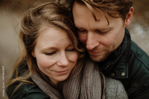Portrait of a tender caucasian couple in their 30s hugging each other