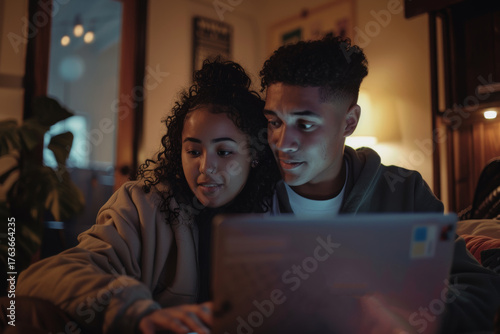 Portrait of a tender mixed race couple in their 20s ordering online looking in laptop