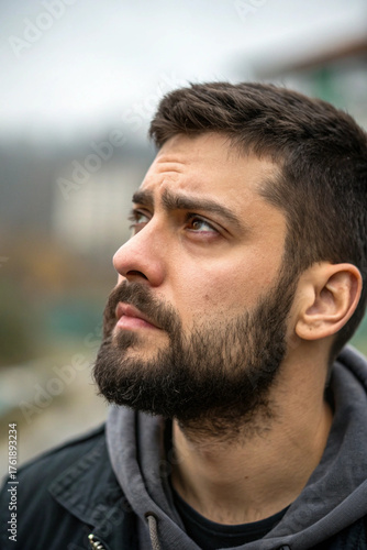 Portrait of a thoughtful man with a beard, looking up with a pensive expression
