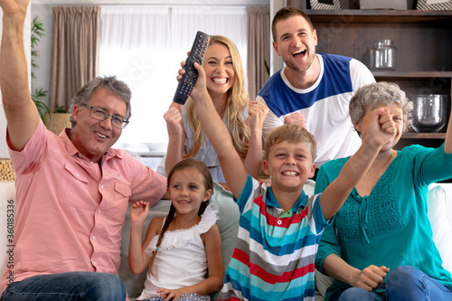 people, real people, home, domestic life, lifestyle, free time, leisure, relaxing, happy, enjoying, smiling, interact, couch, family, family time, together, closeness, human relationships, mother, daughter, father, son, grandfather, grandmother, grandchild, cheering, television, television, fun, fan, remote