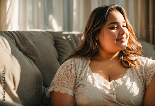 portrait, large, happy, woman, home, american, stylish, relaxing, happiness, smile, positivity, female, attractive, relaxation, weight, girl, plus, size, person, cute, indoor, pretty, sitting, beautiful, fat, obesity, overweight, people, lifestyle