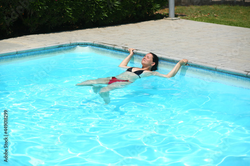 swimwear, recreation, treatment, spa, relax, fitness, float, zen, meditation, chill, caucasian, travel, happy, active, health, resort, activity, healthy, woman, fun, female, vacation, lifestyle, sport, leisure, young, pool, swim, summer, blue, water, bikini
