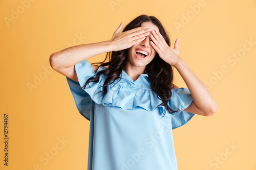eye, covering, isolated, facial, hand, attractive, expression, shot, happiness, adult, studio, people, 1, caucasian, female, fashion, smile, woman, emotion, lip, young, girl, 20s, surprise, person, toothy, cheerful, beautiful, background, coiffure, happy, blue, palm, arm, brunette, smiling, orange