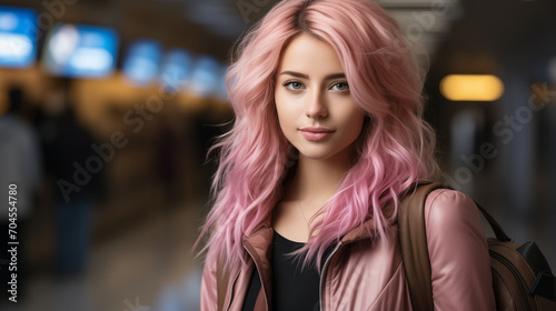 portrait of a woman in the city, At the train or airport, a young lady with pink hair and a bag