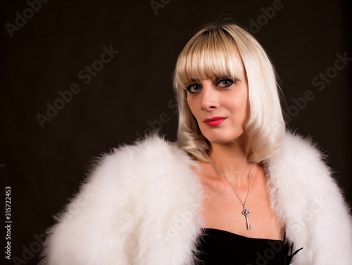 Portrait of a woman with blond hair, wearing a tight dress. On the shoulders of a fur Cape.