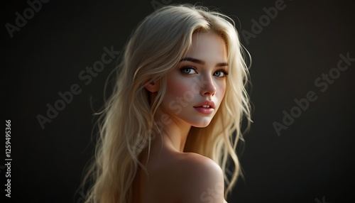 woman, looking, portrait, head shot, blond, hair, posing, shoulder, green eye, fair skin, long hair, facial expression, female, model, studio shot, one person, youth, young, caucasian, human, person, youthful, elegance, glamour, beauty, fashion, cosmetic, make-up, coiffure, hair care, skincare, art, photorealistic, artificial intelligence, digital artwork, creative