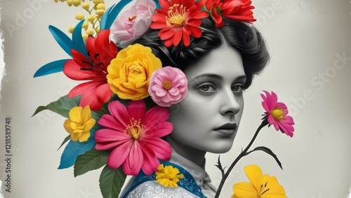 woman, beauty, hair, fashion, face, flower, model, flower, make-up, pink, people, rose, spring, lady, person, red, glamour, art, coiffure, floral, skin, eye, nature, mask, colourful, vintage, 80s, 70s, 90s, retro