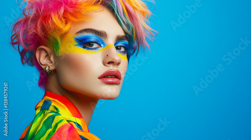 Portrait of a woman with rainbow hair and vibrant makeup against a bright blue background looking sideways