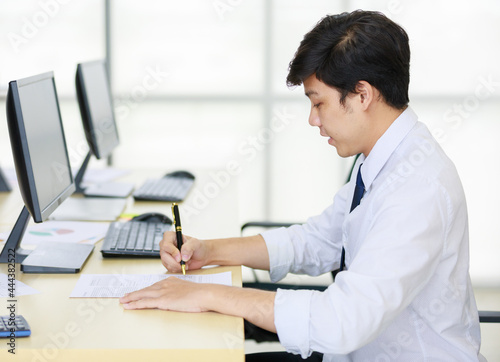 Portrait of a young adult professional businessman working on a paper document in front of a computer at the office table. Business manager signing the signature on the paperwork for approval
