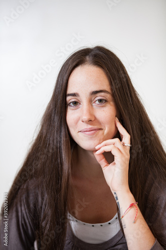 Portrait of a young and sweet natural woman without makeup with long brown hair