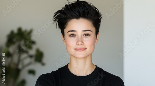 Portrait of a young Asian woman with short, dark hair, wearing a black shirt, smiling gently.