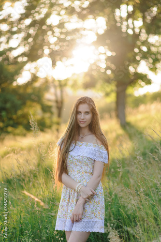 Portrait of a young beautiful girl in a sundress. Summer photo session in the park at sunset. The bright sun shines in the frame.