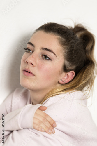 vertical, natural light, face, serious, young, youth, youthful, junior, teenage, children, countenance, visage, side, look, appearance, expression, closeup, studio, isolate, head, head shot, missy, real people, girl, closeup, human lips, front view, human hand, indoor
