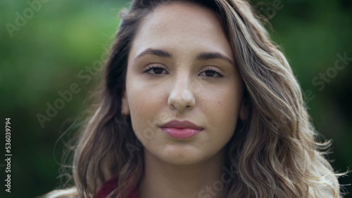 Portrait of a young hispanic woman looking at camera. Casual South American latina girl face closeup standing outdoors at park 2