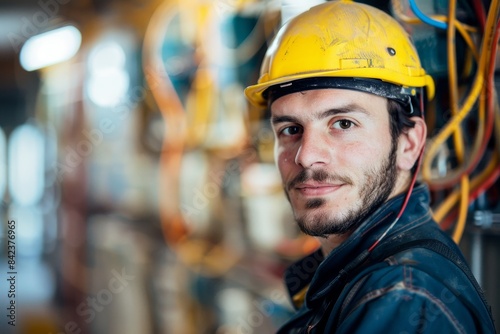 portrait, of, a, young, male, men at work, wearing, hard, hat, looking, at, the, camera, with, confidence, and, diligence, on, job, site, serious, construction, is, safety