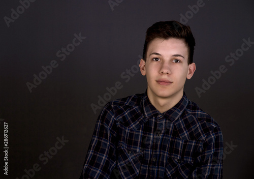 Portrait of a young man of Slavic appearance in a strict suit. Studio photography, plain gray tone