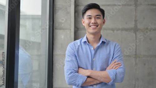 professional, young, adult, confident, stance, modern, business, attire, businessman, asian, man, office, environment, lighting, portrait, urban, setting, corporate, positive, expression, smiling, relaxed, posture
