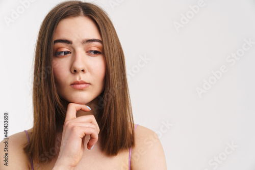 woman, young, adult, white, racked, touch, thinks, face, chin, studio, isolated, model, portrait, calm, pensive, red, indoor, day, 1, people, beauty, close, up