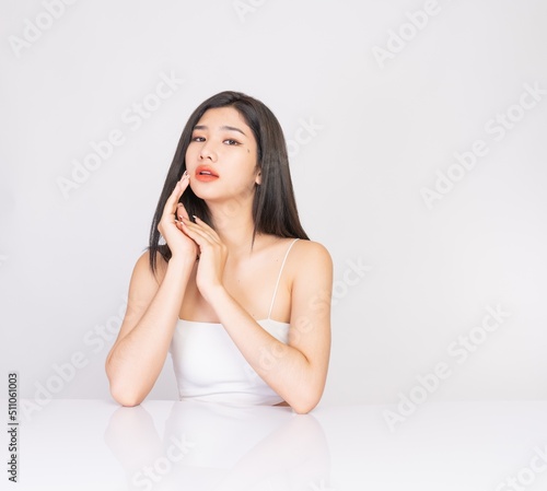 Portrait of a young, smart and very beautiful clean asian sexy female lady wearing white tank top with different elegant poses and emotions against a white studio background