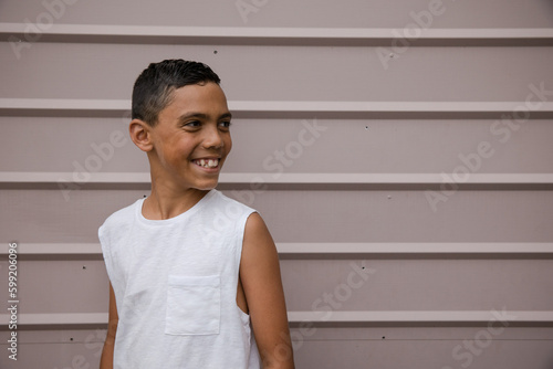 portrait, young, smiling, nation, boy, looking, away, camera, happy, children, australian, person, wall, male, closeup, garage, indigenous, aboriginal, tween, singlet, preteen, black hair