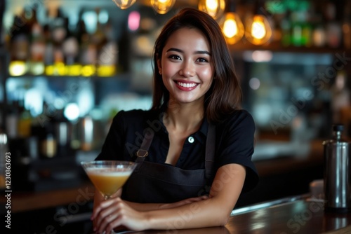 portrait, young, smiling, malaysian, female, barkeeper, blurred, bar, background, asian, cheerful, professional, confident, happy, woman, hospitality, men at work, employee, service, industry, job, occupation, career, leisure, indoor, evening, nightlife, uniform, apron, attractive, pretty, beautiful, charming, positive, friendly, sociable, lively, vibrant, energetic, ethnic, culture, tradition, hot drink, drink, cocktail, alcohol, craft
