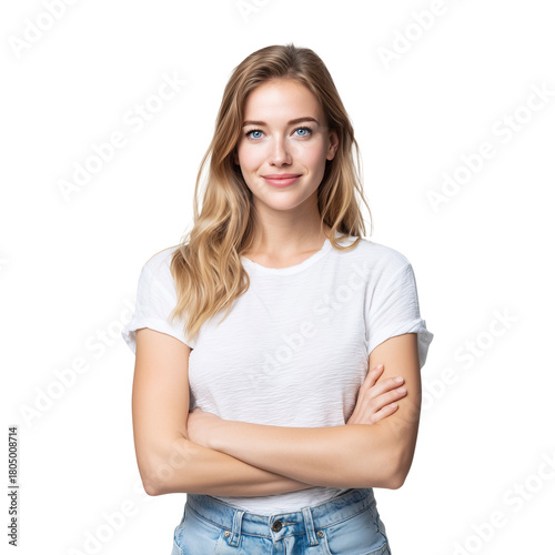 woman, beauty, smile, model, people, face, person, smiling, hair, arm, casual attire, fashion, standing, looking, blond, lady, 1, teenage, crossed, teenage, business, isolated, studio, happiness