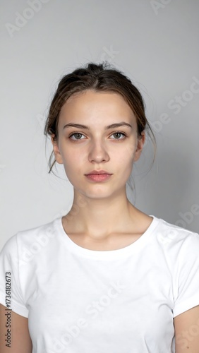 woman, young, portrait, face, serious, calm, neutral, confident, white, t-shirt, simple, plain, casual attire, beauty, style, fashion, portraiture, studio, light, straight hair, pretty