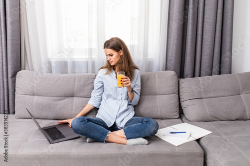 Portrait of a young woman drinking orange juice and surfing in the internet at home sitting on sofa