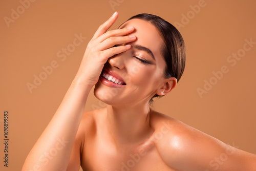 foundation, tone, beauty, female, woman, young, girl, style, spa, salon, cosmetology, procedure, skin, body, care, skincare, bodycare, fashion, model, make-up, cosmetic, brunette, hair, glamour, luxury, beautiful, attractive, tempting, sensual, sexy, naked, beige, radiance, smile, posing, natural, portrait, studio, artistic, feminine, healthy, youthful, soft, washing, cleansing, fresh, wellness, face, removing, hygiene