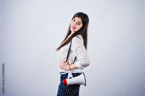 Portrait of a young woman in blue trousers and white blouse posing with megaphone in the studio.