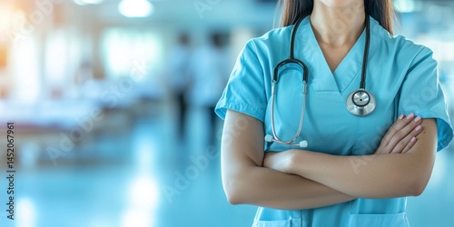 arm, doctor, female, hospital, medicals, nurse, portrait, smile, racked, stethoscope, uniform, woman, young, medicine, health, smiling, health care, care, clinic, people, office, patient, professional, person, coat, occupation, men at work, physician, practitioner, specialist