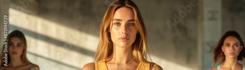 Portrait of a Young Woman in Sunlit Room with Two Blurred Figures in the Background