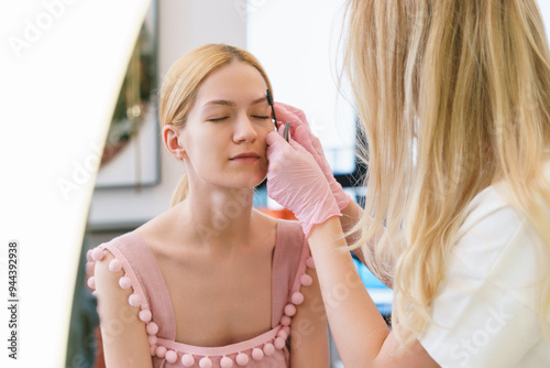 Portrait of a young woman who came to the eyebrow master. Facial skin care in a beauty salon