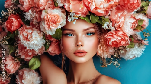 woman, girl, face, portrait, beauty, eye, blue, hair, flower, pink, white, green, floral, flower petals, blossom, bloom, spring, summer, nature, skin, fresh, elegant, delicate, gentle, graceful, feminine, natural, healthy, bright, colourful, vibrant, soft, pastel, youth, closeup, head shot, studio, model, fashion, style, look, pose, expression, make-up, coiffure, flower, crown, head, beautiful