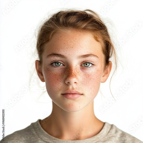 portrait, young, woman, freckle, face, eye, look, expression, girl, beauty, natural, skin, red, light, brown, hair, updo, style, pretty, charming, attractive, caucasian, teenage, calm, serious, sharpened, close, studio, photograph, soft, make-up, minimalist, skincare, smooth, clear, even, healthy, youthful, pale, beautiful, model, lovely