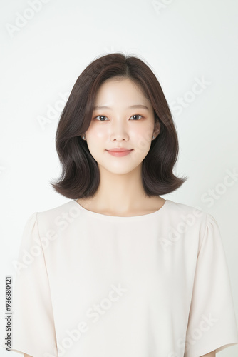 Portrait of a Young Woman with Layered Haircut in Minimalist White Outfit