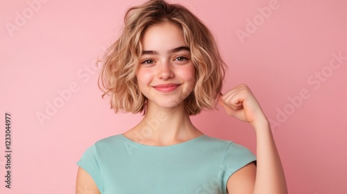 portrait of a young woman with short blonde curly hair, smiling at the camera on a pink background