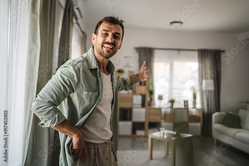 portrait of adult man stand and show wall behind him smile at home