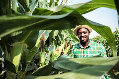 Portrait of Africa American farmer standing with tablet in corn field examining crop at blue sky. Agribusiness and innovation concept