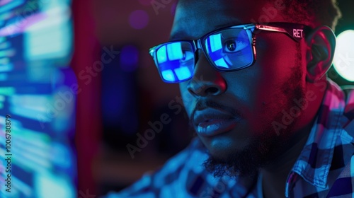 Portrait of African male programmer wearing blue light glasses looking at computer screen with code on it in dark room, working late night in office .