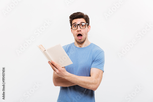 Portrait of agitated smart man wearing eyeglasses reading book with open mouth, isolated over white background