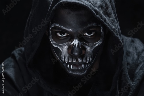 Portrait of an African American man with skeleton face paint, wearing a black hooded robe, copy space in the middle, in a black background, Halloween theme, spooky and skeletal, haunting lighting.