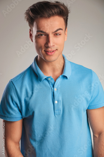 man, male, guy, young, sexy, attractive, photogenic, casual attire, modern, hair, style, coiffure, look, people, happy, smile, confident, blue, polo, shirt, fashion, model, background, caucasian, latin, grey, grey, success, standing, studio, portrait, face, head, shoulder, positive, eye, fit, slim, hand, angry, anger, upset, furious