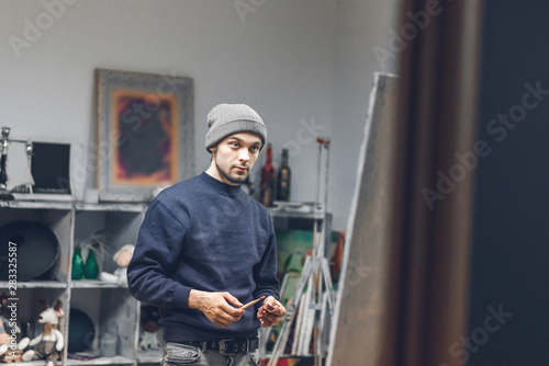 Portrait of an artist student with a brush in his hand in a cozy art studio near an easel with a canvas. Man studies painting in an art studio. Learning painting.
